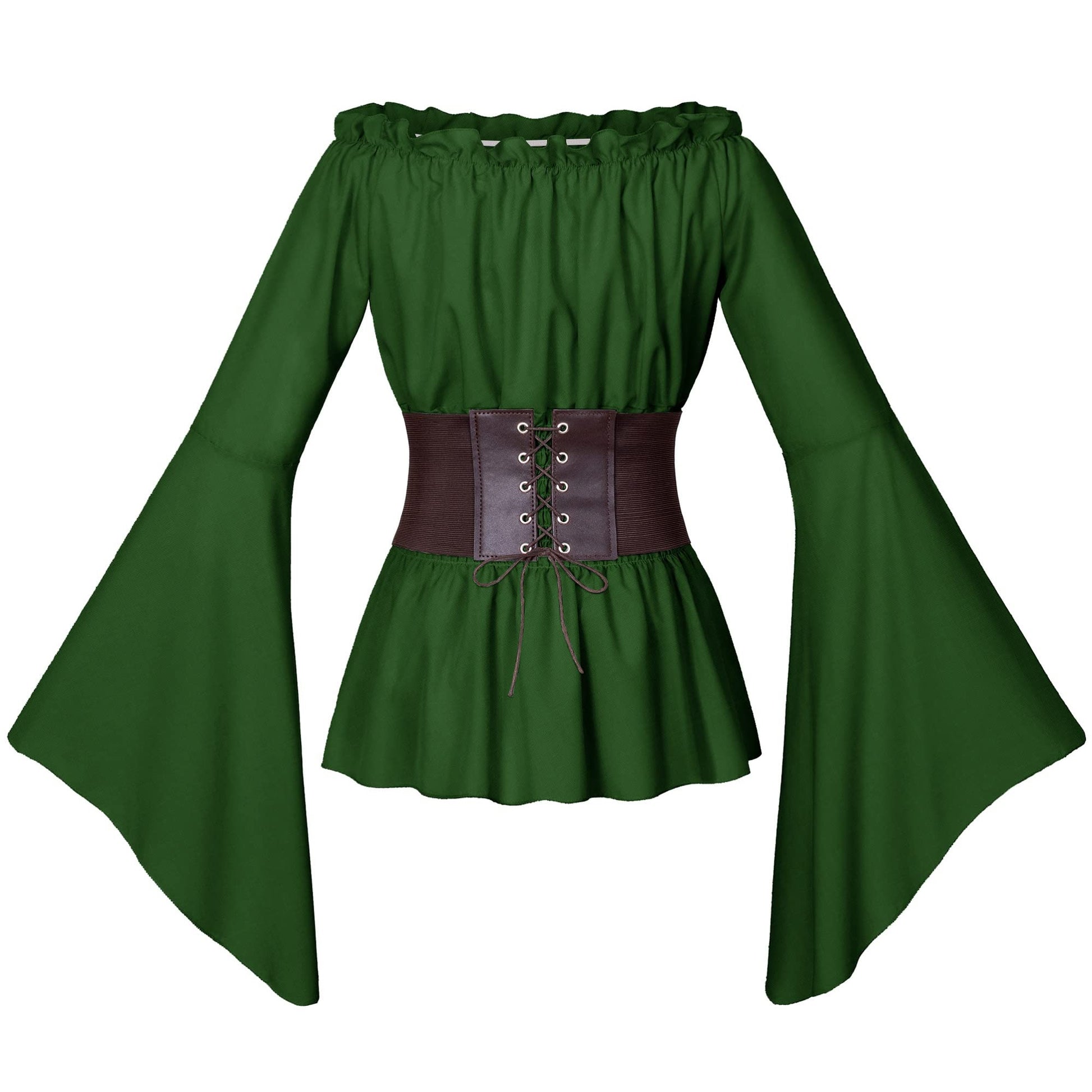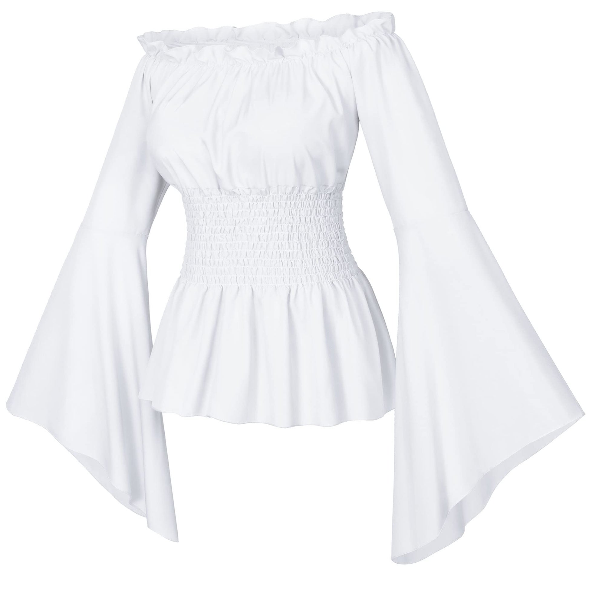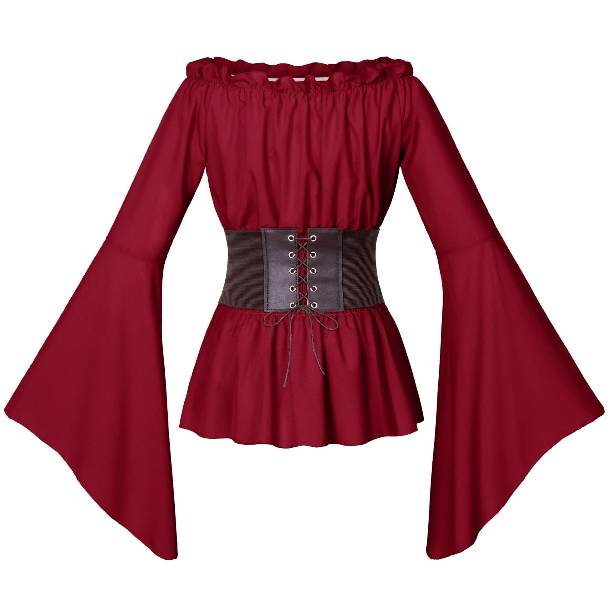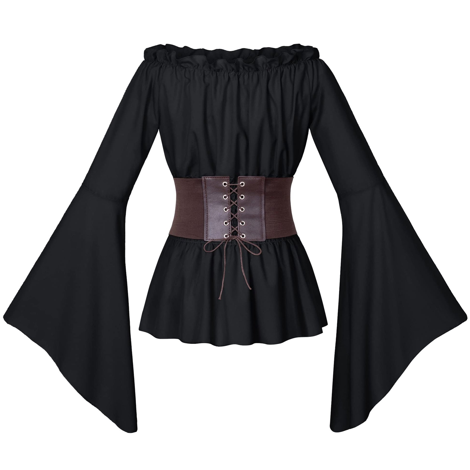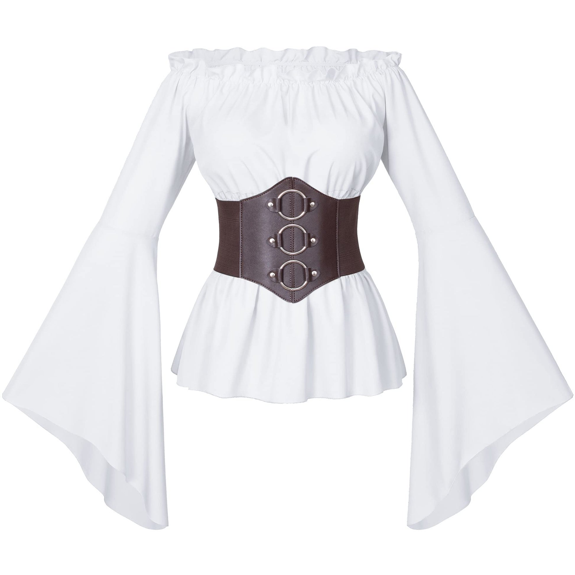 TIPS:the key parameter of the top:Bust.High-elastic waist style pirate shirt. Package includes: Womens victorian boho blouse top 1 , Stretchy PU leather corset waist belt 1, 2-piece set Renaissance blouse off shoulder trumpet long sleeve tops is easily match with different outfits. Stretchy PU leather corset waist belt shapes your waist well, can show off your charming curves, hide your stomach fat. Womens long sleeve pirate renaissance victorian peasant gothic ruffle smocked waist boho pirate shirt blouse with stretchy PU leather corset waist belt set cosplay costumes Size Information: Size S:Length 24.0" ----Bust 33.5-35.4"----Sleeve 25.6" Size M:Length 24.8"----Bust 35.8-37.4"---- Sleeve 26.0" Size L:Length 25.6"----Bust 37.8-39.4"----Sleeve 26.4" Size XL:Length 26.0"----Bust 39.8-41.3"----Sleeve 26.8" Size 2XL:Length 26.8"---- Bust 41.7-43.3"----Sleeve 27.2" Size 3XL:Length 27.2"----Bust 43.7-45.3"---- Sleeve 27.2" Plus size 5XL:Length 27.6"----Bust 46.5-49.2"----Sleeve 27.6"