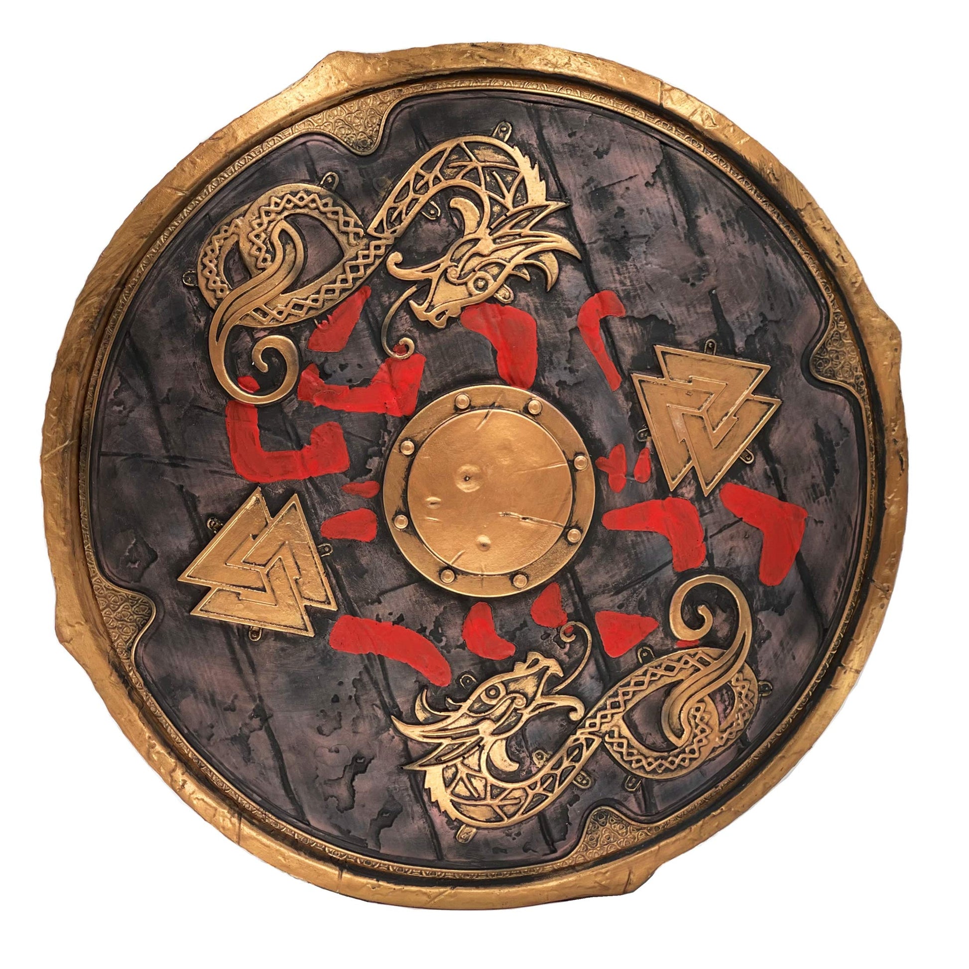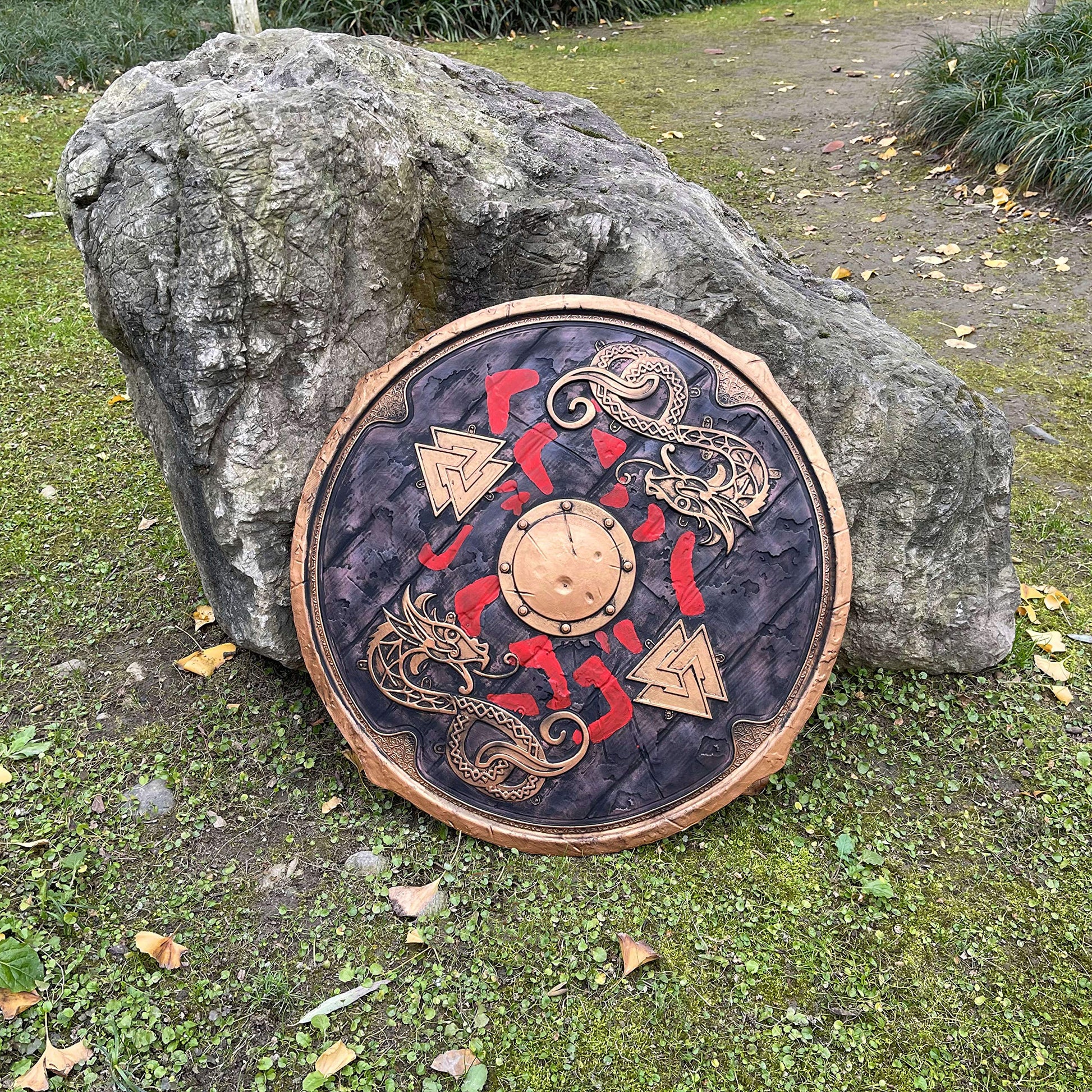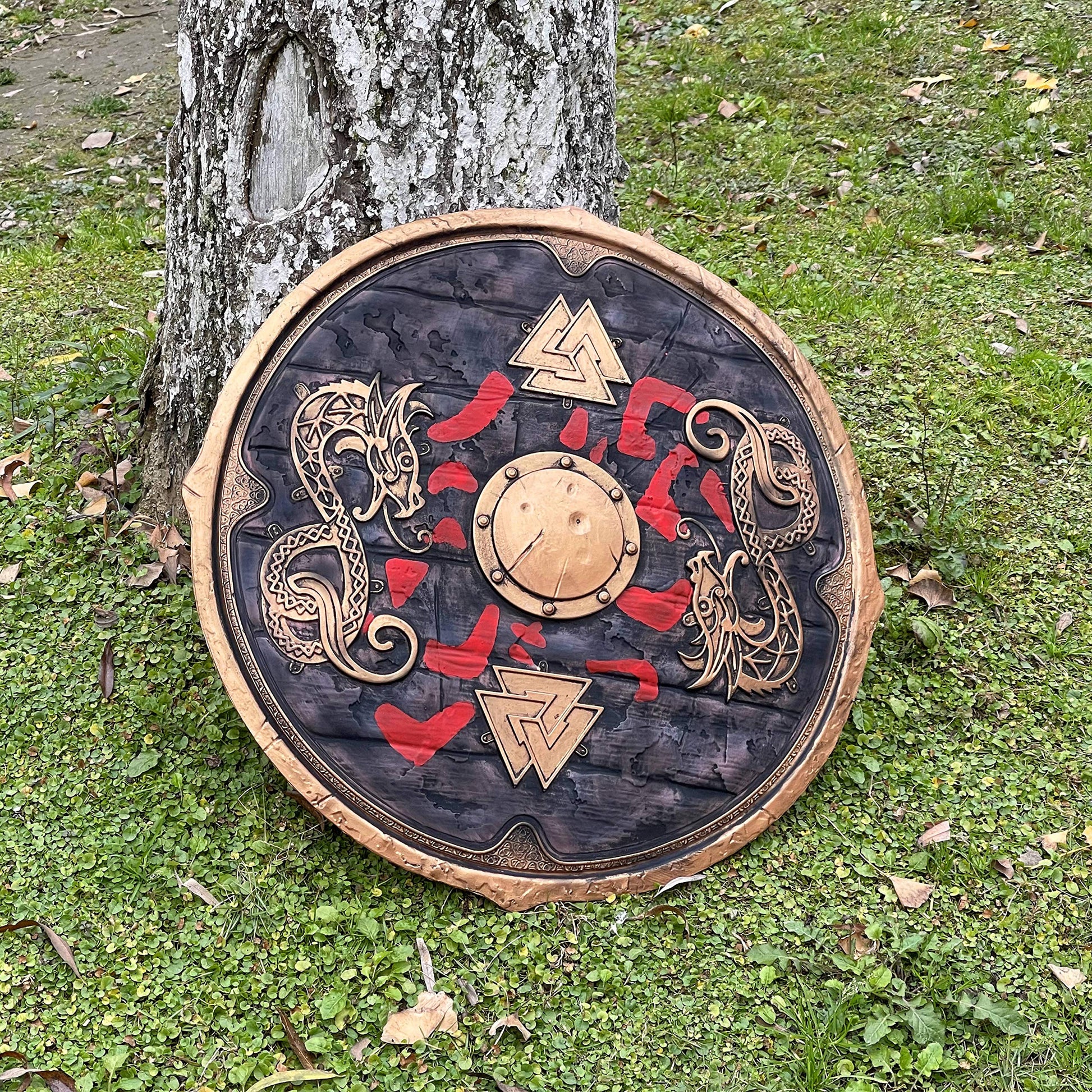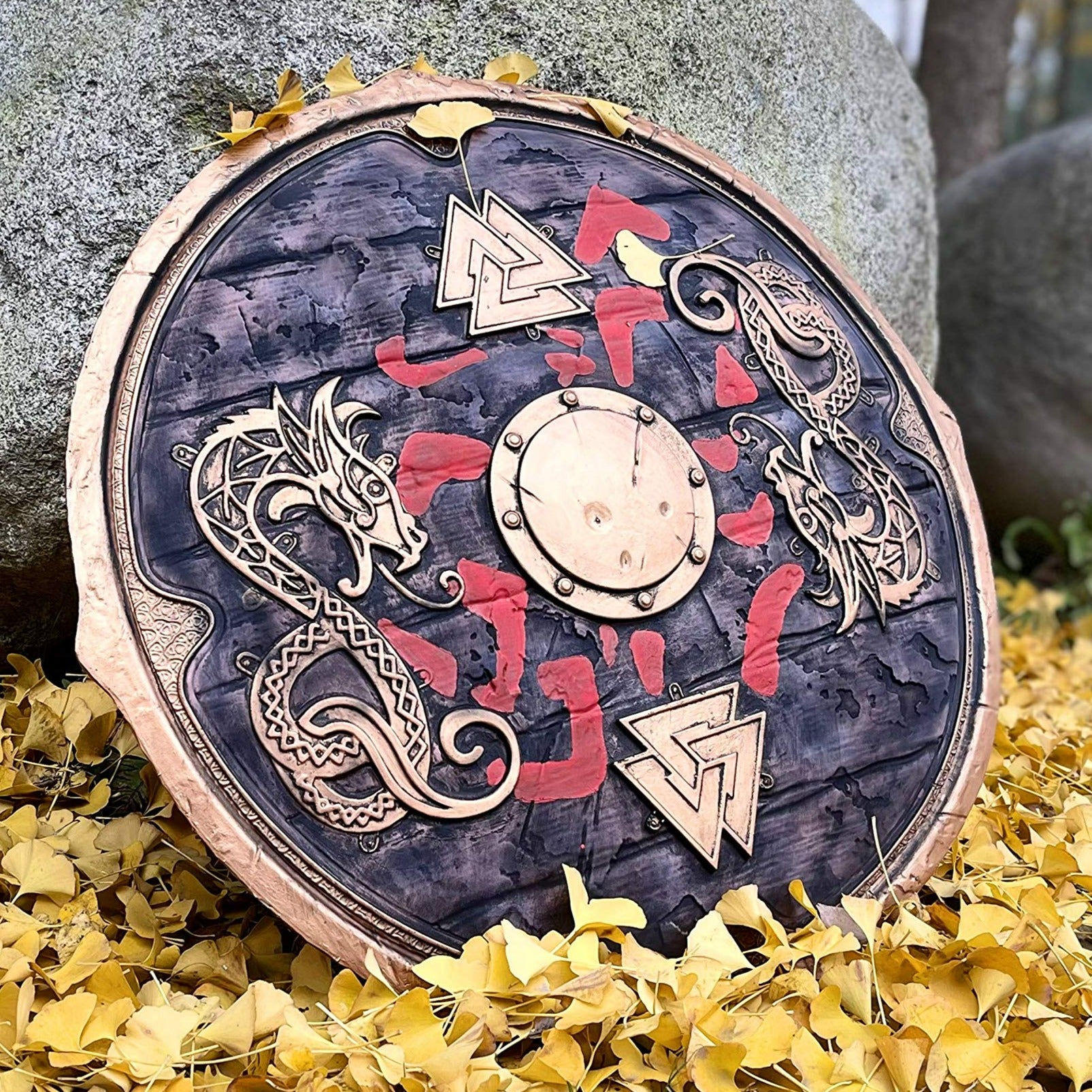 - Not Flimsy. Made of high quality PU foam with realistic wood and metal appearance colored paint.The shield is engraved with a Viking symbol called "valknut" and a Viking dragon totem. The edge of the shield is decorated in Viking style.This shield is an excellent choice for the Viking warrior costume game.