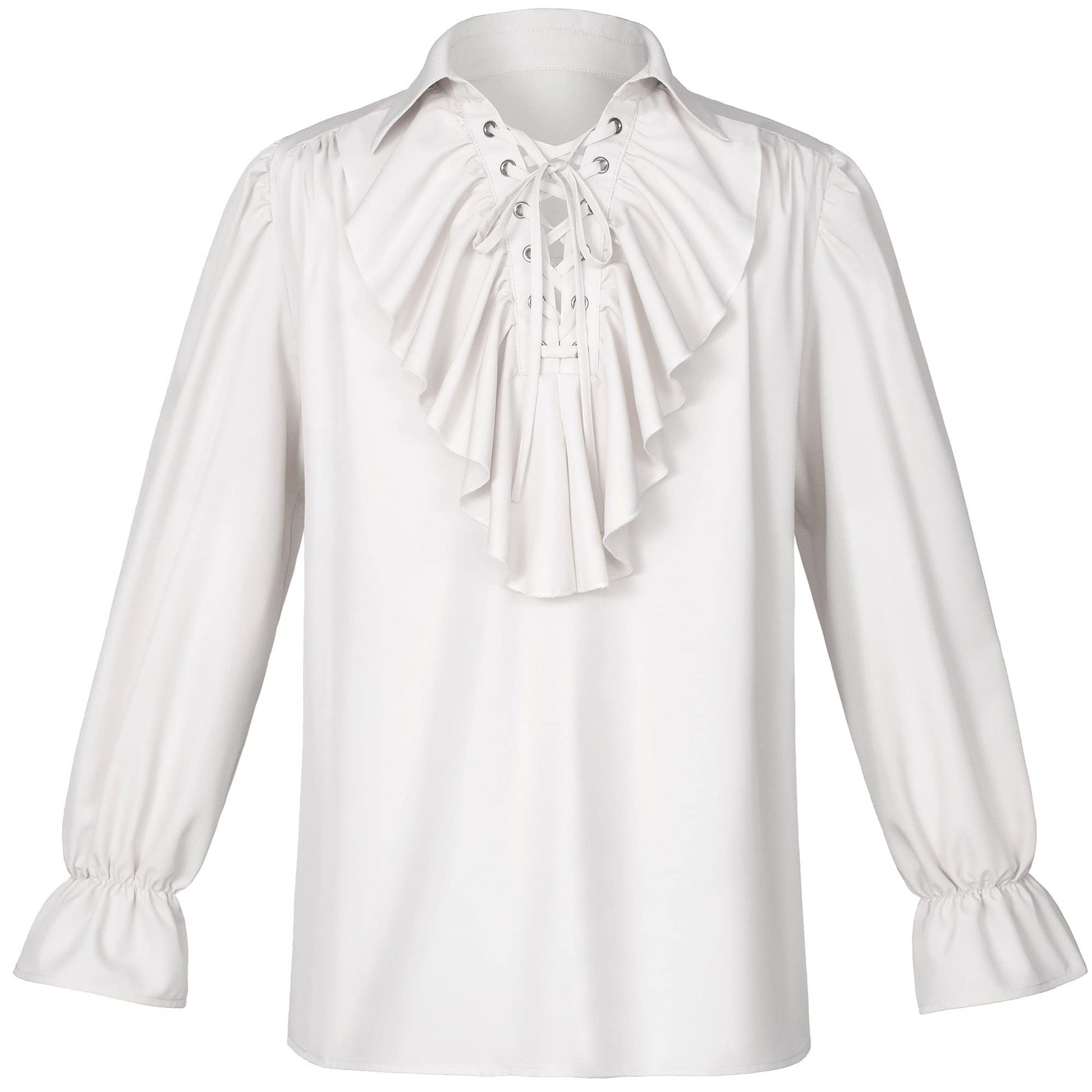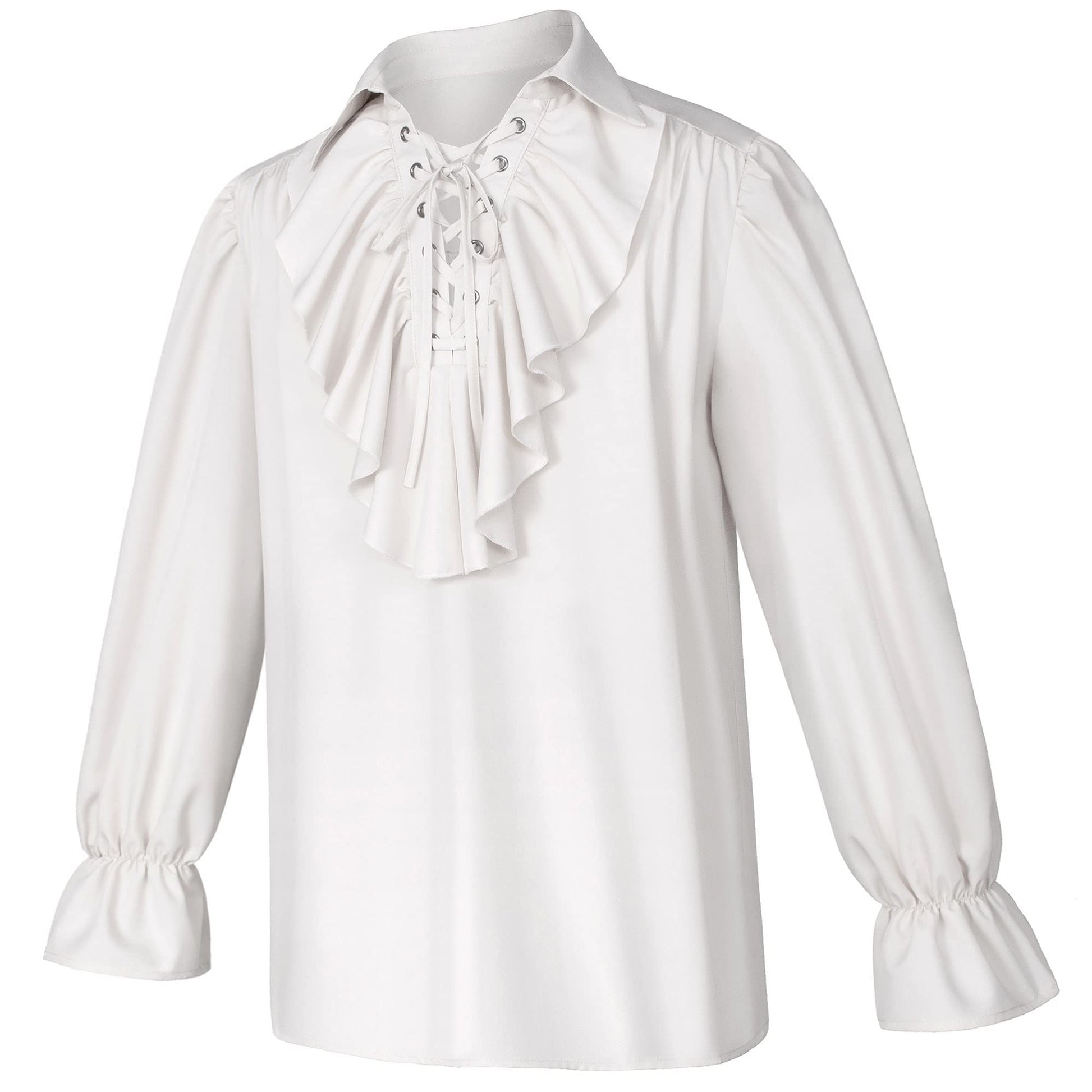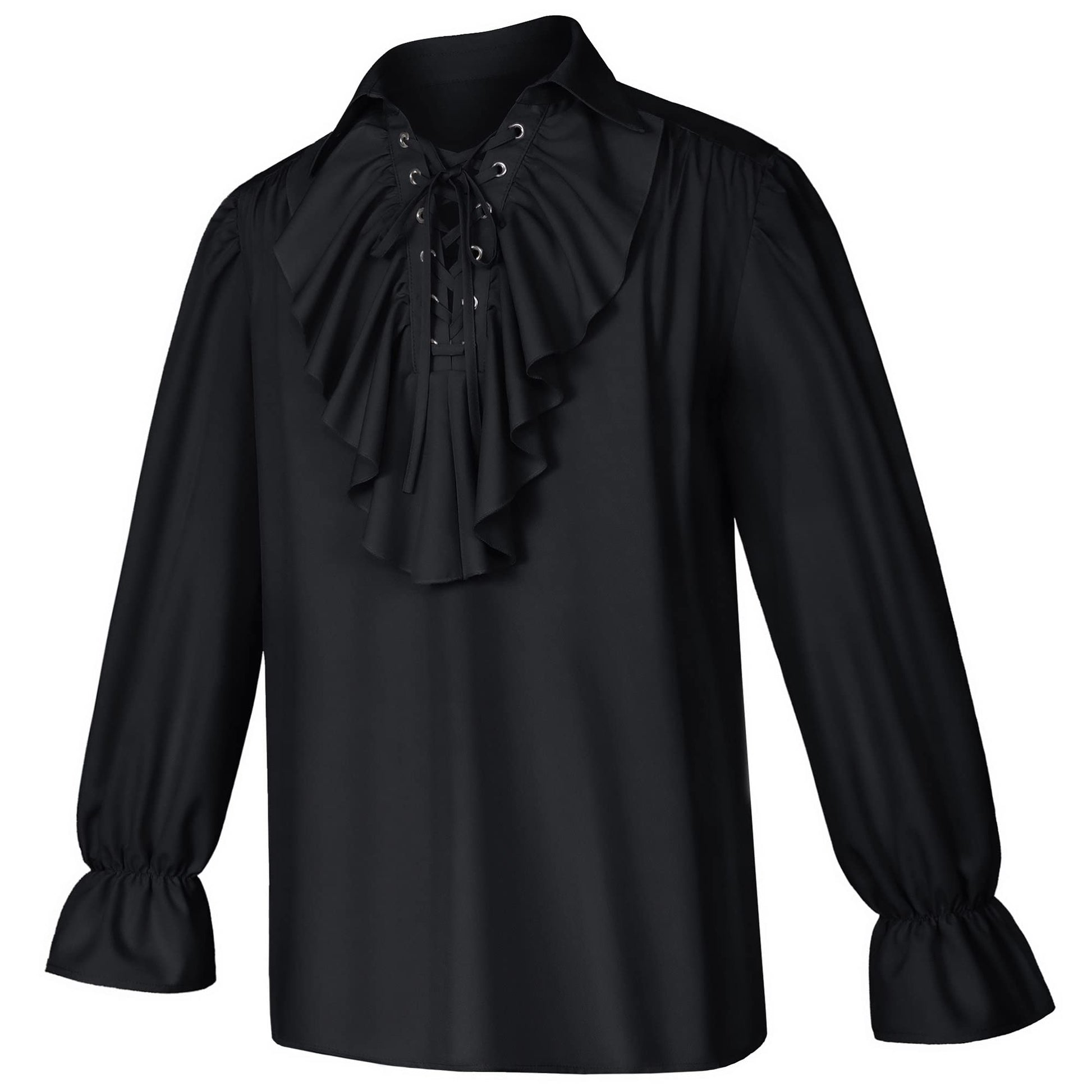 Renaissance men's women's viking pirate lace up colonial shirt medieval victorian vampire steampunk gothic ruffled halloween clothing tops waist belt sash set. Solid color and retro style, cosplay costume shits for men's and women's. Lace-up neckline sleeves with delicate ruffles cuff, Soft and lightweight polyester fabric, keep you cool, dry and moving comfortably. This shirt is suitable for many characters,you can pair this vintage dress shirt with vest and suit jacket for a elegant yet sophisticate look; Or pair the renaissance shirt with steampunk jacket for victorian gothic costume; Pair it with a skinny jeans, and tall boots for a captain hook costume.You won't regret it. Suitable for many occasions, wedding, groom, masquerade, pirate cosplay show, theatrical show, vampire, 18 cent period, Victorian, gothic, for a captain hook costume, medieval, elizabethan, halloween party, colonial day, renaissance fair, concert, festival, graduation season school party, stage peformence, etc. Size Information: Size S:Length 29.9"----Shoulder 16.9"---- Bust 47.2"----Sleeve Length 25.6" Size M:Length 30.7"----Shoulder 17.7"---- Bust 49.6"----Sleeve Length 26.0" Size L:Length 31.5"----Shoulder 18.9"---- Bust 54.3"----Sleeve Length 28.0" Size XL:Length 31.9"----Shoulder 19.7"---- Bust 56.7"----Sleeve Length 29.1" Size 2XL:Length 32.3"----Shoulder 20.5"---- Bust 59.8"----Sleeve Length 30.7"