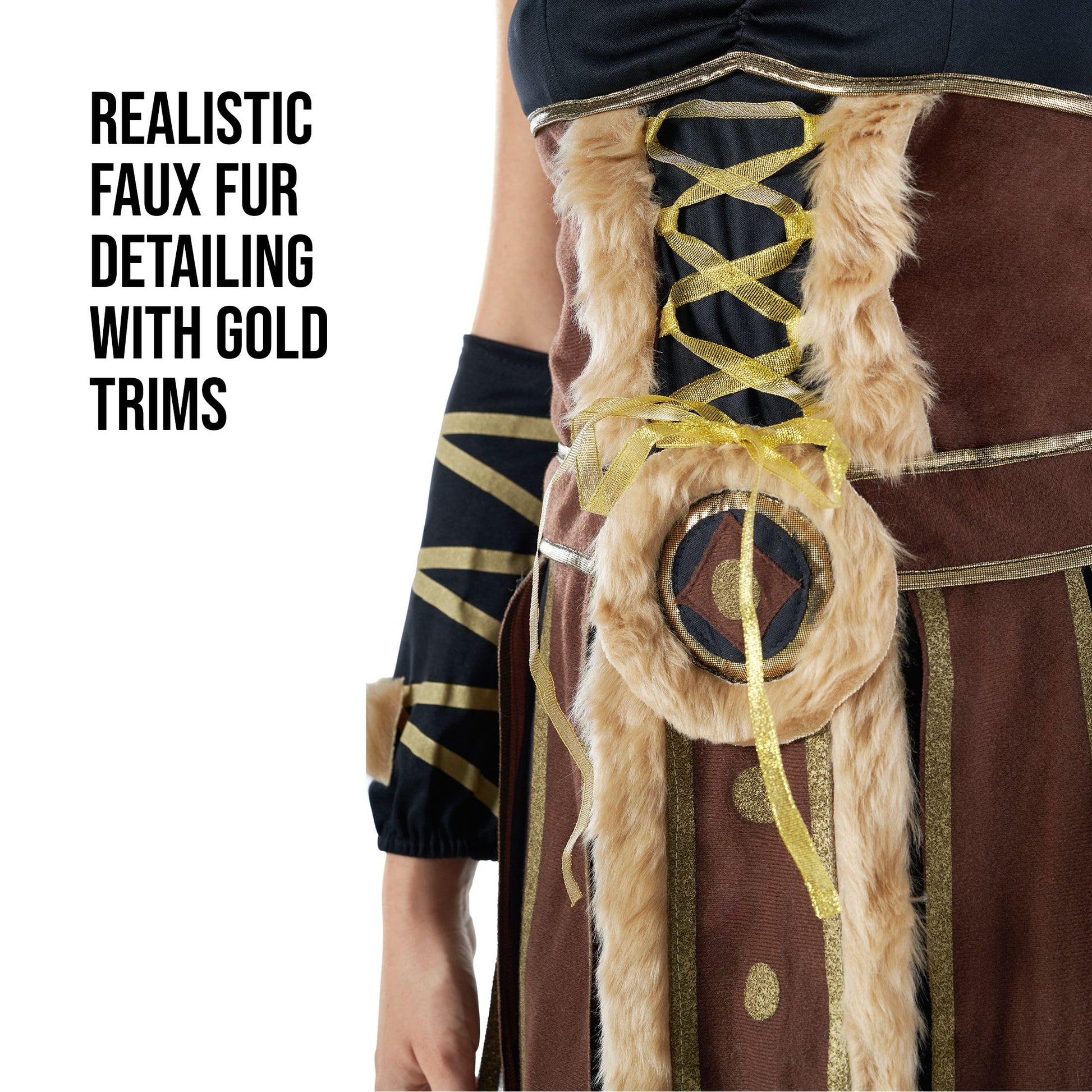 Viking warrior costume women includes faux fur & gold trimmed dress, horned viking hat and gold-detailed arm & leg ties. Women's viking costume is made to be breathable, soft and comfortable for all body types. Our costumes are designed to last more than one wear, so you can rock the look another time! Womens viking warrior costume is available in sizes Medium 8-10 , Large 12-14, X-Large 16-18. Please refer to the size chart, in the product images, for further size details. Founded in 2009 by 3 friends with a passion for costumes, we now have 100s of designs all manufactured to the highest standards of fit and design. We have offices in the US, UK and Europe. Perfect for Halloween parties, viking queen costume women, viking Halloween costume, viking princess costume women, female viking cosplay, womens viking dress, female warrior costume, viking fur, viking costume woman, viking costumes for women.