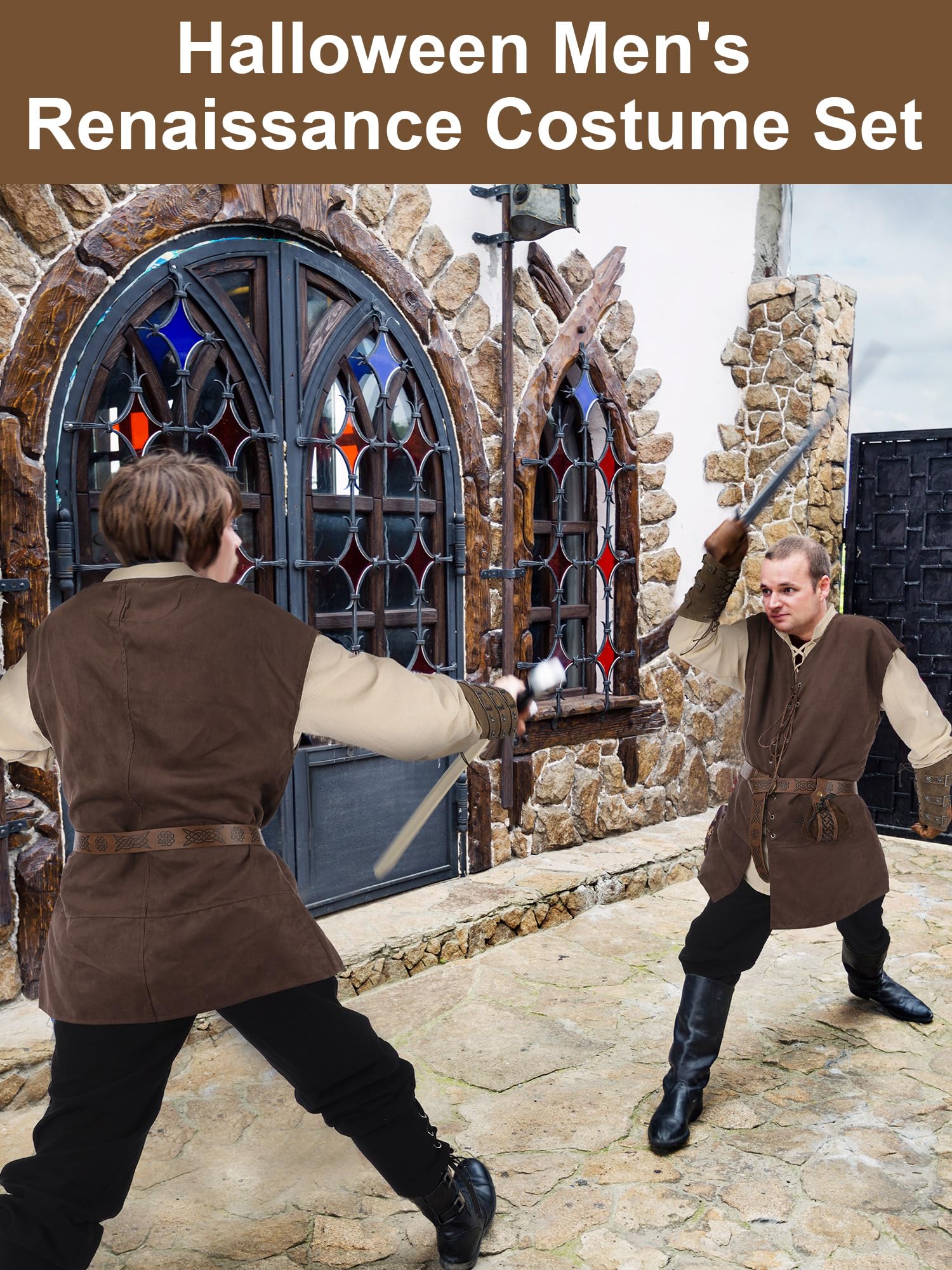 Suhine 6 Pcs Men's Renaissance Costume Set Medieval Vest Shirt Ankle Banded Pants Viking Belt Armband Pouch