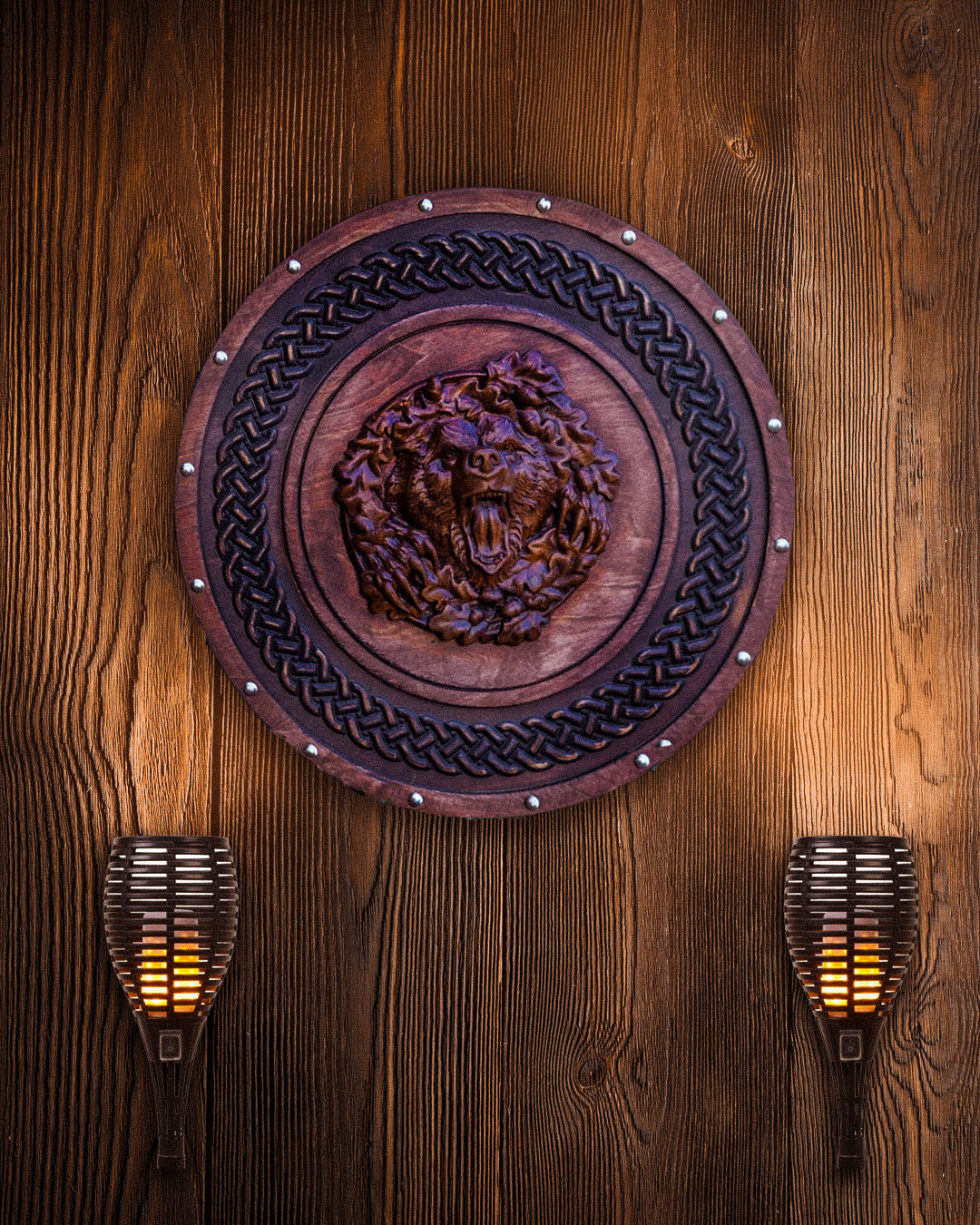 - This shield features a bear head carved in oak wood, attached to the center of the plywood base, with ornamental relief carved along the rim and decorative steel bolts.