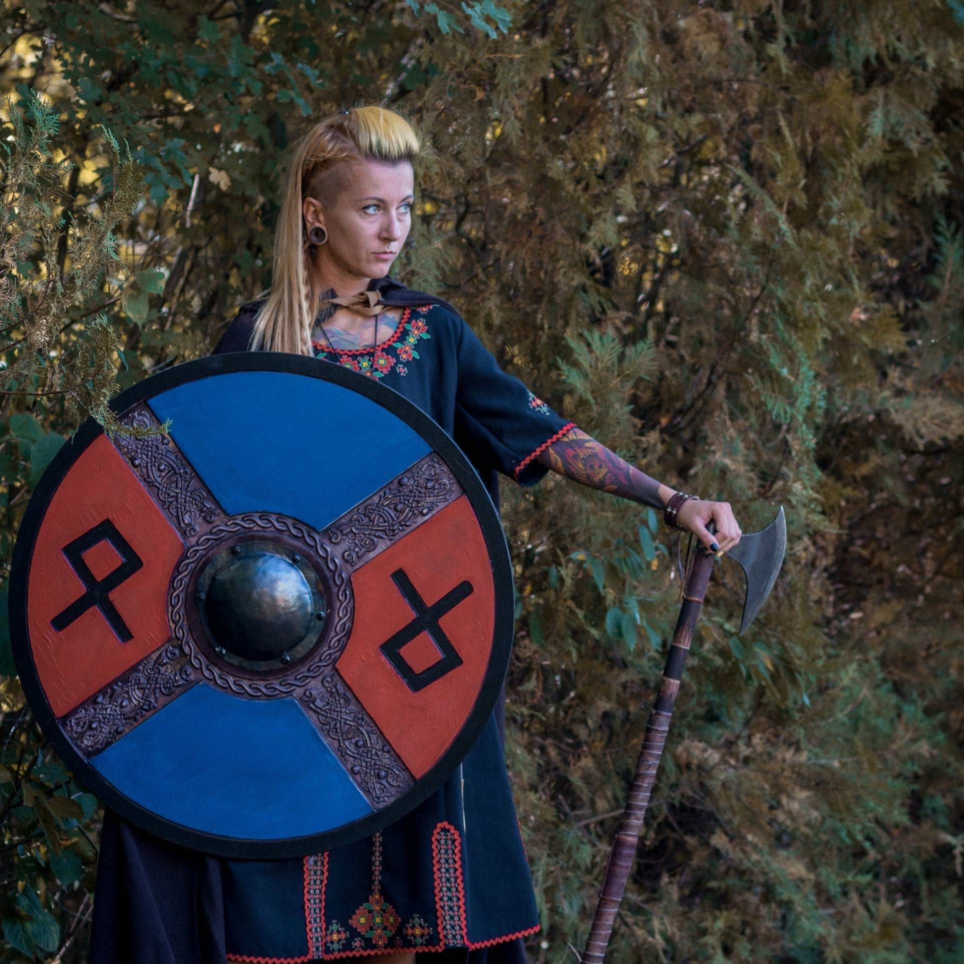 Handcarved Blue And Red Style Rune Viking shield, 24"