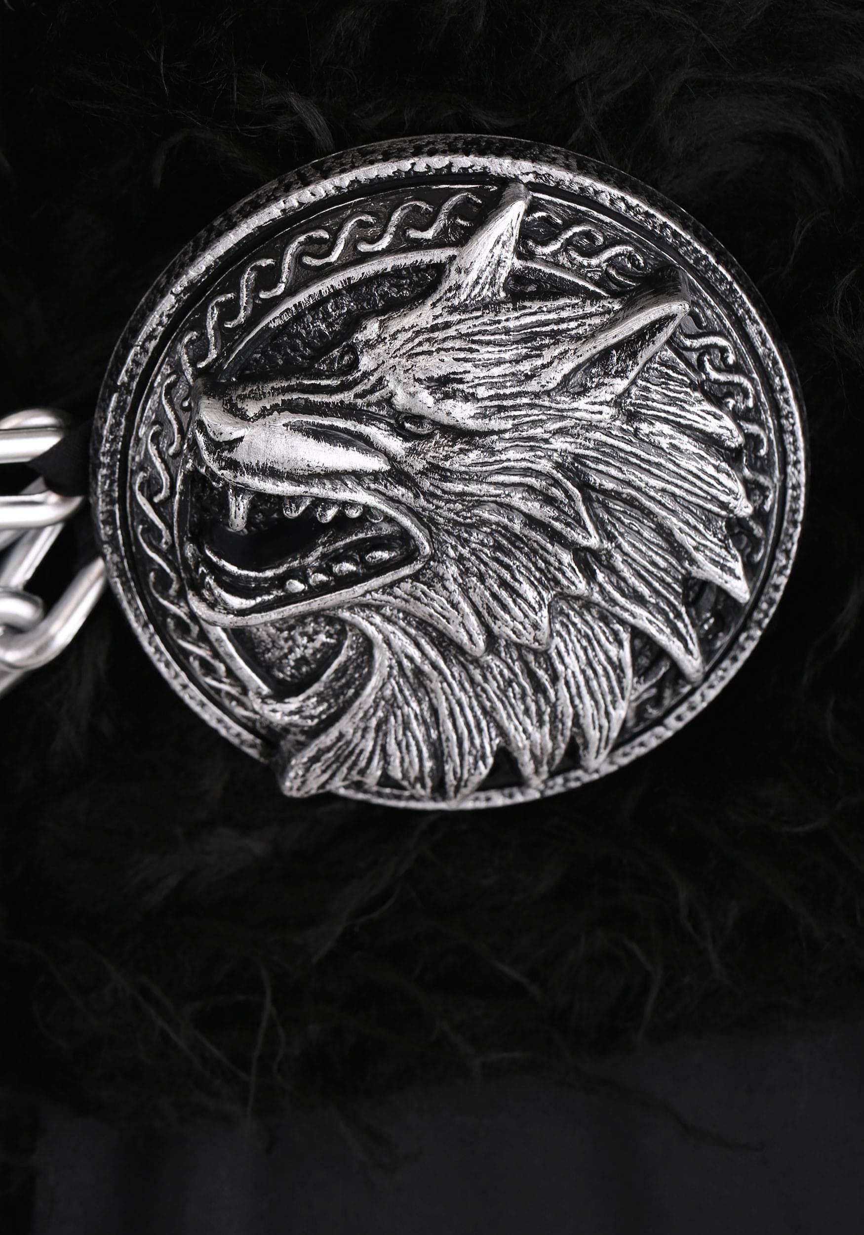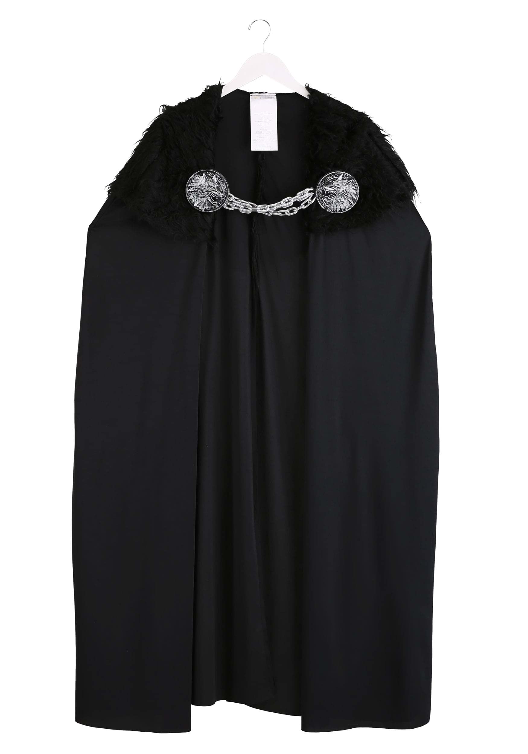 Mighty warrior's who fight as a pack. The wolf clan cape features a fur yoke top with wolf medallions and chain trim clasps. Not included: shirt, headband, sword, pants, boots.