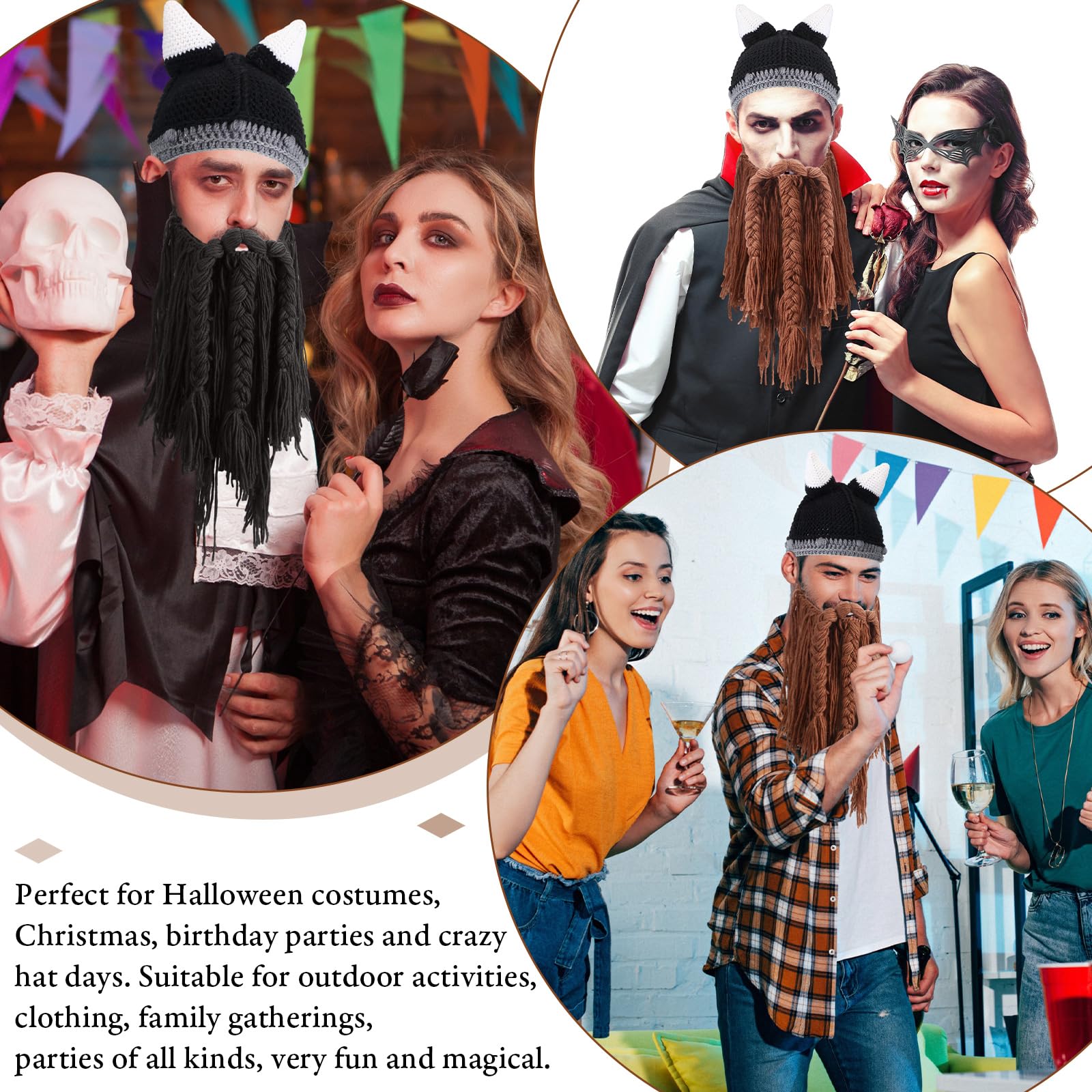 2 Pcs Viking Horn Beard Hat Handmade Creative Knit Wig Mask